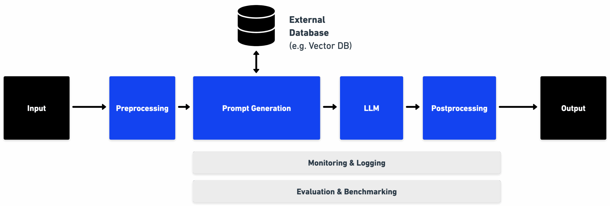 Additional steps are required to build production systems with LLMs. Below, we demonstrate a simple case with one forward pass through an LLM to produce an output yet there can be also more complex systems with multiple tasks to be solved by LLMs.