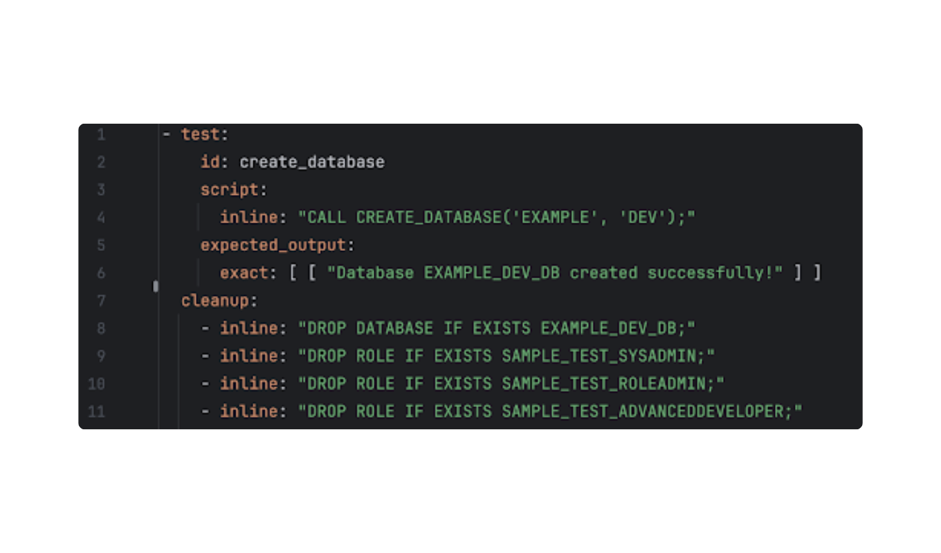 - Post-Execution State Checks: This is a critical feature for infrastructure testing. Stored procedures often return a simple “Success” message, which is insufficient for verifying that a schema or role was actually created. Our framework allows users to define multiple checks (e.g., running SHOW SCHEMAS) after the main test.