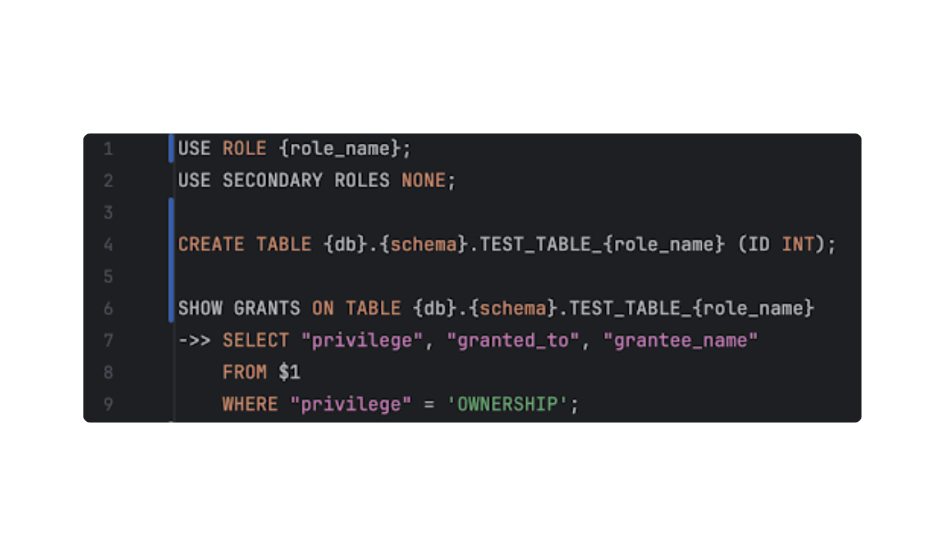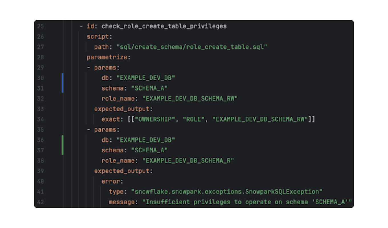 - Parametrization: If a script contains standard Python formatting placeholders (like {role_name}), the framework can iterate through a list of parameters. It invokes the same SQL script with different inputs for each pass, evaluating the results, whether success or expected error, independently. This allows a single test definition to validate dozens of infrastructure scenarios.